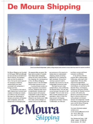 De Moura Shipping foi fundada em 30 de agosto de 1993 e apesar de sua área central de atuação ser a América do Sul, a companhia não limita suas atividades neste continente. Durante os trinta anos de existência da companhia, vários negócios foram fechados com companhias na Europa e Ásia.