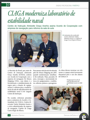 A parceria com a Marinha do Brasil, materializada principalmente na grande benemerência no CIAGA, iniciou-se em 2006 e ainda perdura. As salas de aula adotadas e patrocinadas pela De Moura Shipping aparecem nas páginas 37, 41, 48 e 49, e 52.